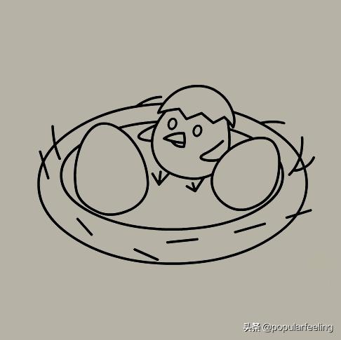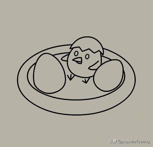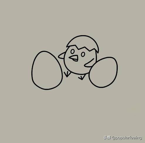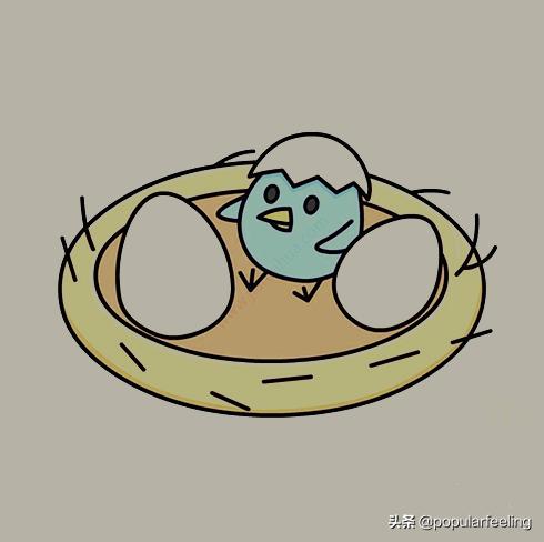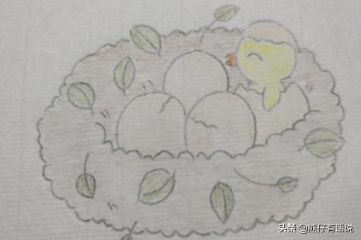 第五步:在半个鸟蛋上边画出一个小鸟,这只小鸟已经出生了。