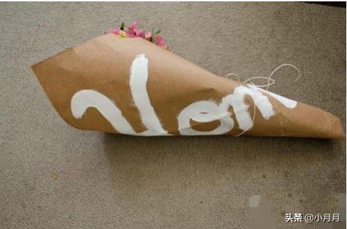 4、 将牛皮纸的一角往花束根部一折,随后整张纸卷起,绑紧。